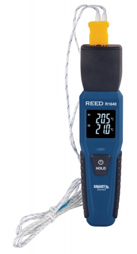 The R1640 is a 2-channel compact thermocouple thermometer that can be used either stand-alone or with the Reed Smart Series App (available for download on Android and iOS). When connected to the App, the R1640 can be set up to data log measurements over a given period.