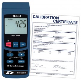 The Reed R8100SD Data Logging Light Meter has a wide measurement range up to 100,000 Lux (10,000 Foot Candles) and features data hold, min/max functions, and an easy-to-read backlit LCD display. Using a SD card (max 16GB), a user can manually record up to 99 readings or automatically by selecting a desired sampling rate from 1 to 3600 seconds. Quickly generate an Excel file with raw data, all without the use of software. Optional accessories include a tripod and AC adapter for continuous long-term monitoring.